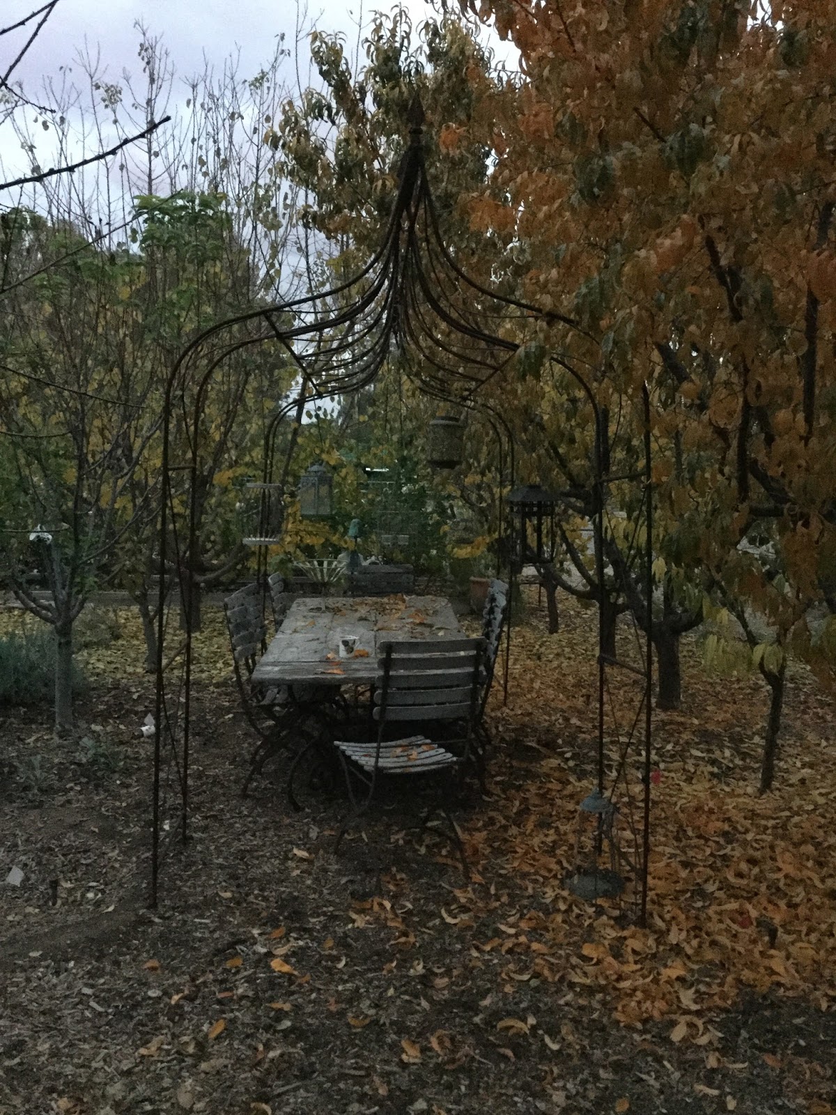 The gazebo in the shelter of the fruit tree allele experiences the changes of Autumn. The Northern trees are already bare and sleeping. While the Southern Trees are still undergoing their color changes as they nod off to their brief respite before Spring. Soon this old teak table that has served as door in an earlier life will bask in the sun before it again is the site of celebrations, classes, meals, teas, refreshment, planning and creating. We can't wait to invite you and hope that you'll be joining us!